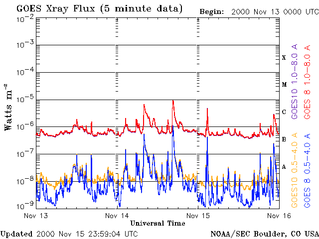 The operational data in the graph above has been modified to remove the scaling factor that has been applied by the Space Weather Prediction Center (SWPC). Because of the SWPC scaling factor in the operational data, flare indices for the operational data were reported as 42% smaller than for the science quality data. The scaling factor has also been removed from the solar flare list to reflect the true physical units.
