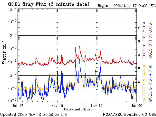 The operational data in the graph above has been modified to remove the scaling factor that has been applied by the Space Weather Prediction Center (SWPC). Because of the SWPC scaling factor in the operational data, flare indices for the operational data were reported as 42% smaller than for the science quality data. The scaling factor has also been removed from the solar flare list to reflect the true physical units.