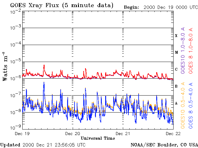 The operational data in the graph above has been modified to remove the scaling factor that has been applied by the Space Weather Prediction Center (SWPC). Because of the SWPC scaling factor in the operational data, flare indices for the operational data were reported as 42% smaller than for the science quality data. The scaling factor has also been removed from the solar flare list to reflect the true physical units.