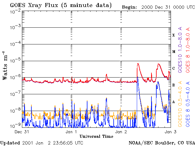 The operational data in the graph above has been modified to remove the scaling factor that has been applied by the Space Weather Prediction Center (SWPC). Because of the SWPC scaling factor in the operational data, flare indices for the operational data were reported as 42% smaller than for the science quality data. The scaling factor has also been removed from the solar flare list to reflect the true physical units.