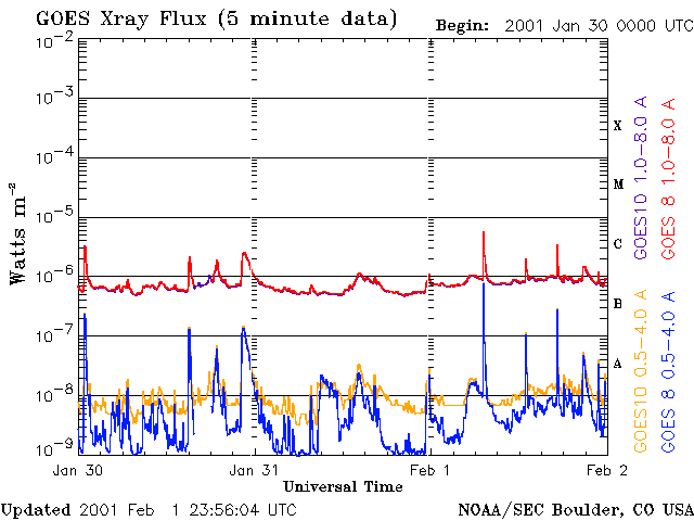 The operational data in the graph above has been modified to remove the scaling factor that has been applied by the Space Weather Prediction Center (SWPC). Because of the SWPC scaling factor in the operational data, flare indices for the operational data were reported as 42% smaller than for the science quality data. The scaling factor has also been removed from the solar flare list to reflect the true physical units.