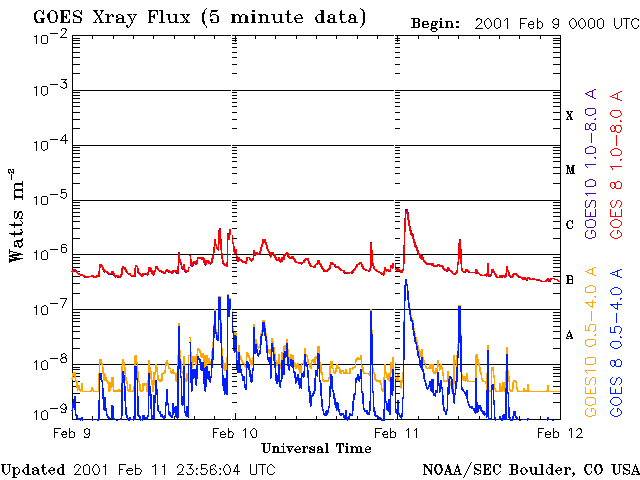 The operational data in the graph above has been modified to remove the scaling factor that has been applied by the Space Weather Prediction Center (SWPC). Because of the SWPC scaling factor in the operational data, flare indices for the operational data were reported as 42% smaller than for the science quality data. The scaling factor has also been removed from the solar flare list to reflect the true physical units.