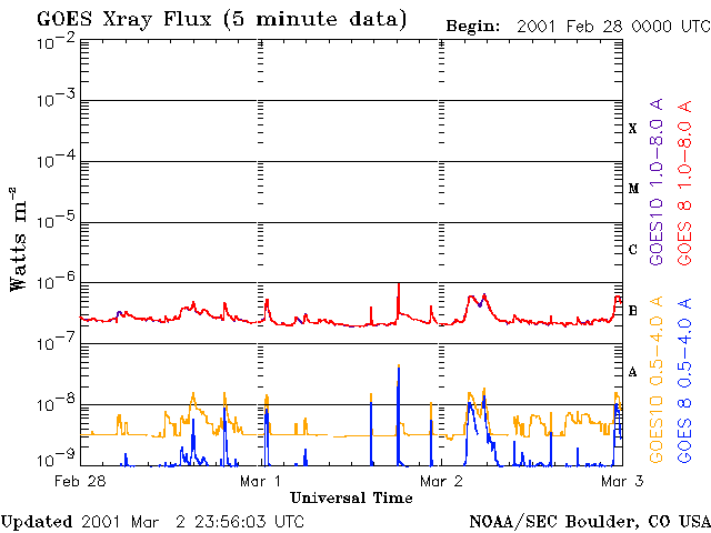 The operational data in the graph above has been modified to remove the scaling factor that has been applied by the Space Weather Prediction Center (SWPC). Because of the SWPC scaling factor in the operational data, flare indices for the operational data were reported as 42% smaller than for the science quality data. The scaling factor has also been removed from the solar flare list to reflect the true physical units.