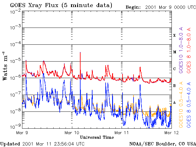 The operational data in the graph above has been modified to remove the scaling factor that has been applied by the Space Weather Prediction Center (SWPC). Because of the SWPC scaling factor in the operational data, flare indices for the operational data were reported as 42% smaller than for the science quality data. The scaling factor has also been removed from the solar flare list to reflect the true physical units.