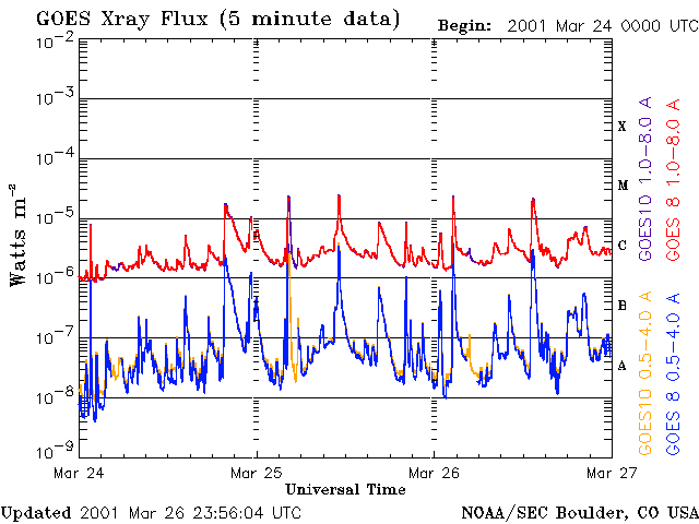 The operational data in the graph above has been modified to remove the scaling factor that has been applied by the Space Weather Prediction Center (SWPC). Because of the SWPC scaling factor in the operational data, flare indices for the operational data were reported as 42% smaller than for the science quality data. The scaling factor has also been removed from the solar flare list to reflect the true physical units.