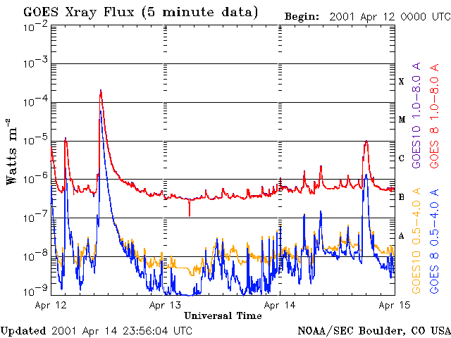 The operational data in the graph above has been modified to remove the scaling factor that has been applied by the Space Weather Prediction Center (SWPC). Because of the SWPC scaling factor in the operational data, flare indices for the operational data were reported as 42% smaller than for the science quality data. The scaling factor has also been removed from the solar flare list to reflect the true physical units.