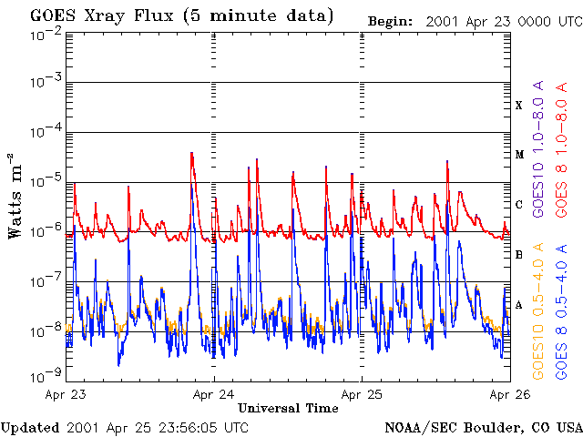 The operational data in the graph above has been modified to remove the scaling factor that has been applied by the Space Weather Prediction Center (SWPC). Because of the SWPC scaling factor in the operational data, flare indices for the operational data were reported as 42% smaller than for the science quality data. The scaling factor has also been removed from the solar flare list to reflect the true physical units.
