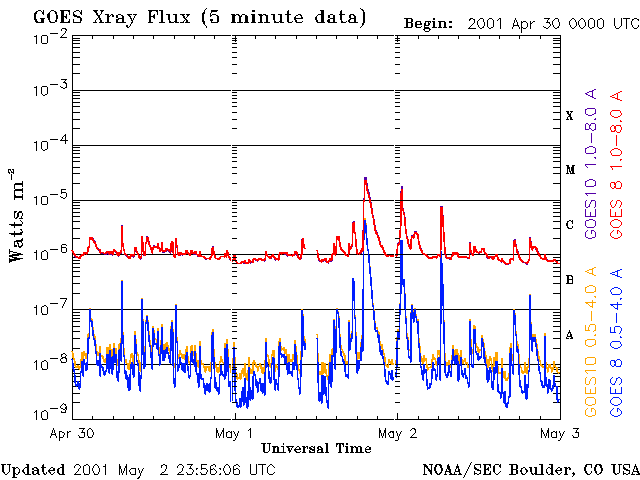 The operational data in the graph above has been modified to remove the scaling factor that has been applied by the Space Weather Prediction Center (SWPC). Because of the SWPC scaling factor in the operational data, flare indices for the operational data were reported as 42% smaller than for the science quality data. The scaling factor has also been removed from the solar flare list to reflect the true physical units.