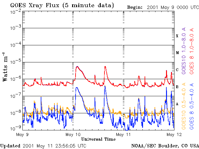 The operational data in the graph above has been modified to remove the scaling factor that has been applied by the Space Weather Prediction Center (SWPC). Because of the SWPC scaling factor in the operational data, flare indices for the operational data were reported as 42% smaller than for the science quality data. The scaling factor has also been removed from the solar flare list to reflect the true physical units.