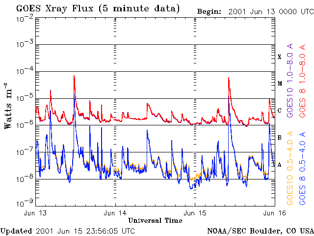 The operational data in the graph above has been modified to remove the scaling factor that has been applied by the Space Weather Prediction Center (SWPC). Because of the SWPC scaling factor in the operational data, flare indices for the operational data were reported as 42% smaller than for the science quality data. The scaling factor has also been removed from the solar flare list to reflect the true physical units.