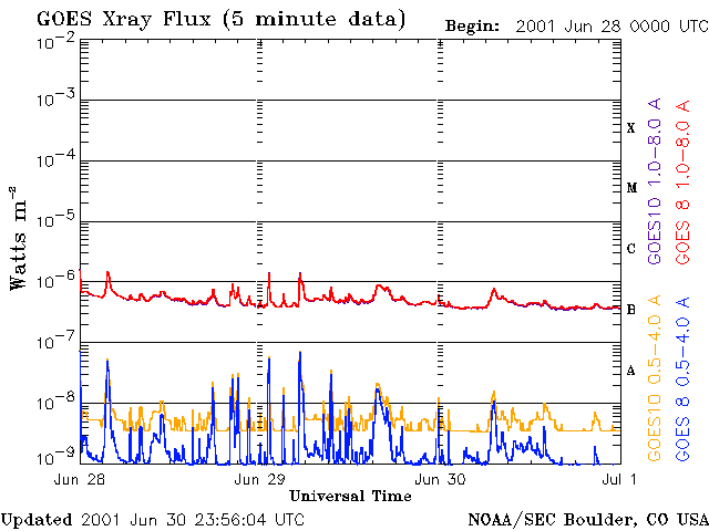 The operational data in the graph above has been modified to remove the scaling factor that has been applied by the Space Weather Prediction Center (SWPC). Because of the SWPC scaling factor in the operational data, flare indices for the operational data were reported as 42% smaller than for the science quality data. The scaling factor has also been removed from the solar flare list to reflect the true physical units.