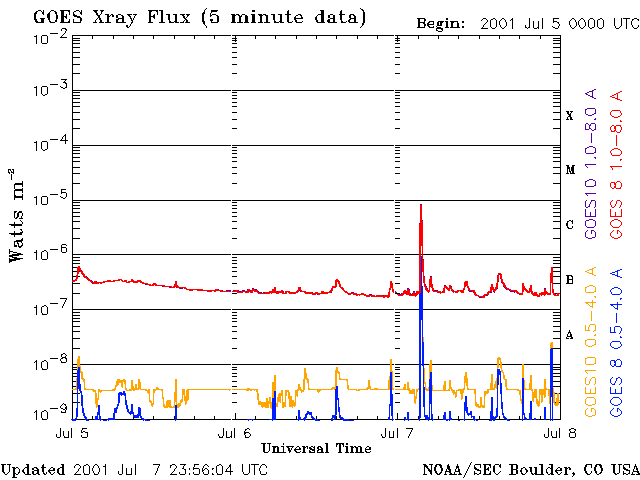 The operational data in the graph above has been modified to remove the scaling factor that has been applied by the Space Weather Prediction Center (SWPC). Because of the SWPC scaling factor in the operational data, flare indices for the operational data were reported as 42% smaller than for the science quality data. The scaling factor has also been removed from the solar flare list to reflect the true physical units.
