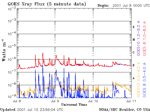 The operational data in the graph above has been modified to remove the scaling factor that has been applied by the Space Weather Prediction Center (SWPC). Because of the SWPC scaling factor in the operational data, flare indices for the operational data were reported as 42% smaller than for the science quality data. The scaling factor has also been removed from the solar flare list to reflect the true physical units.