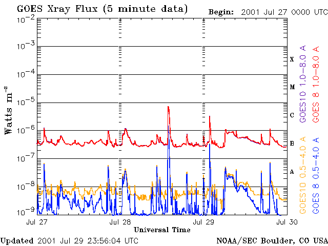 The operational data in the graph above has been modified to remove the scaling factor that has been applied by the Space Weather Prediction Center (SWPC). Because of the SWPC scaling factor in the operational data, flare indices for the operational data were reported as 42% smaller than for the science quality data. The scaling factor has also been removed from the solar flare list to reflect the true physical units.