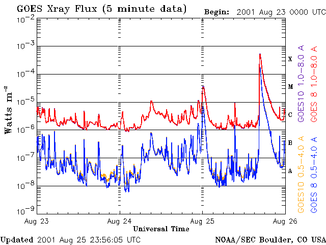 The operational data in the graph above has been modified to remove the scaling factor that has been applied by the Space Weather Prediction Center (SWPC). Because of the SWPC scaling factor in the operational data, flare indices for the operational data were reported as 42% smaller than for the science quality data. The scaling factor has also been removed from the solar flare list to reflect the true physical units.