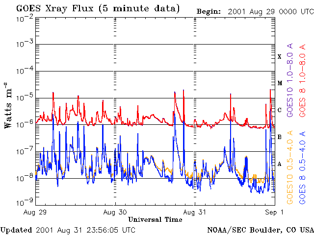The operational data in the graph above has been modified to remove the scaling factor that has been applied by the Space Weather Prediction Center (SWPC). Because of the SWPC scaling factor in the operational data, flare indices for the operational data were reported as 42% smaller than for the science quality data. The scaling factor has also been removed from the solar flare list to reflect the true physical units.