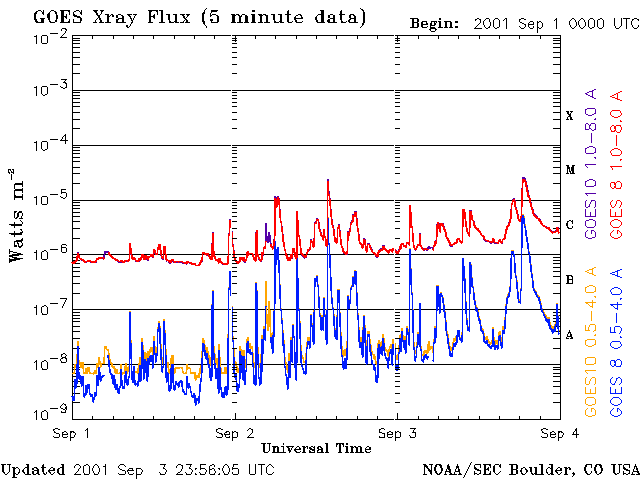 The operational data in the graph above has been modified to remove the scaling factor that has been applied by the Space Weather Prediction Center (SWPC). Because of the SWPC scaling factor in the operational data, flare indices for the operational data were reported as 42% smaller than for the science quality data. The scaling factor has also been removed from the solar flare list to reflect the true physical units.