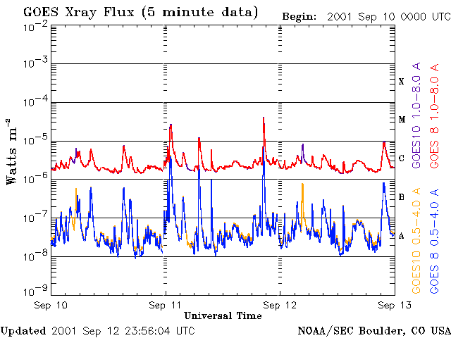 The operational data in the graph above has been modified to remove the scaling factor that has been applied by the Space Weather Prediction Center (SWPC). Because of the SWPC scaling factor in the operational data, flare indices for the operational data were reported as 42% smaller than for the science quality data. The scaling factor has also been removed from the solar flare list to reflect the true physical units.