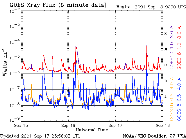 The operational data in the graph above has been modified to remove the scaling factor that has been applied by the Space Weather Prediction Center (SWPC). Because of the SWPC scaling factor in the operational data, flare indices for the operational data were reported as 42% smaller than for the science quality data. The scaling factor has also been removed from the solar flare list to reflect the true physical units.