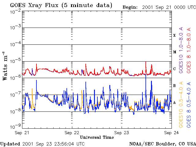 The operational data in the graph above has been modified to remove the scaling factor that has been applied by the Space Weather Prediction Center (SWPC). Because of the SWPC scaling factor in the operational data, flare indices for the operational data were reported as 42% smaller than for the science quality data. The scaling factor has also been removed from the solar flare list to reflect the true physical units.