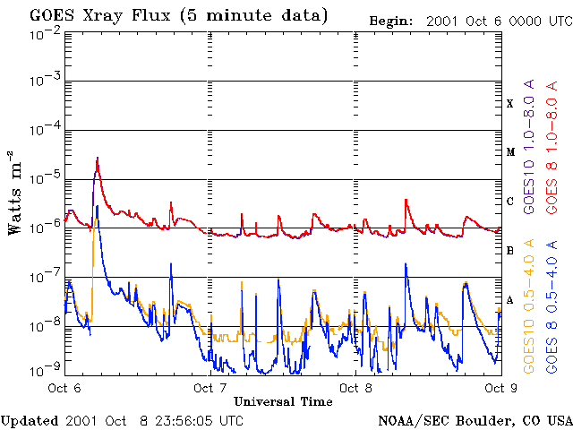 The operational data in the graph above has been modified to remove the scaling factor that has been applied by the Space Weather Prediction Center (SWPC). Because of the SWPC scaling factor in the operational data, flare indices for the operational data were reported as 42% smaller than for the science quality data. The scaling factor has also been removed from the solar flare list to reflect the true physical units.