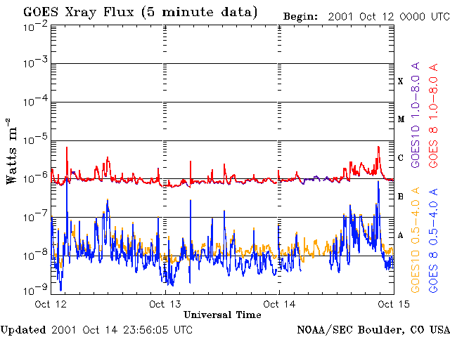 The operational data in the graph above has been modified to remove the scaling factor that has been applied by the Space Weather Prediction Center (SWPC). Because of the SWPC scaling factor in the operational data, flare indices for the operational data were reported as 42% smaller than for the science quality data. The scaling factor has also been removed from the solar flare list to reflect the true physical units.