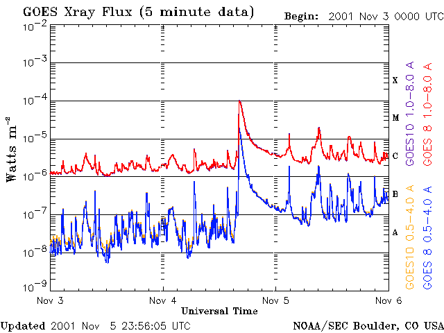 The operational data in the graph above has been modified to remove the scaling factor that has been applied by the Space Weather Prediction Center (SWPC). Because of the SWPC scaling factor in the operational data, flare indices for the operational data were reported as 42% smaller than for the science quality data. The scaling factor has also been removed from the solar flare list to reflect the true physical units.