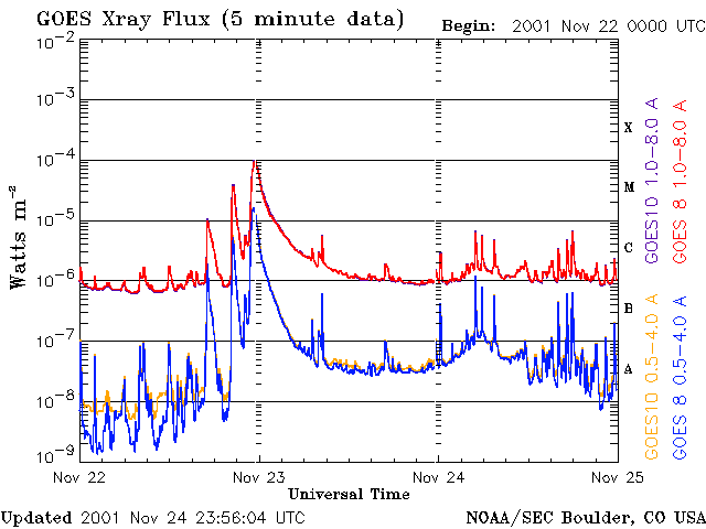 The operational data in the graph above has been modified to remove the scaling factor that has been applied by the Space Weather Prediction Center (SWPC). Because of the SWPC scaling factor in the operational data, flare indices for the operational data were reported as 42% smaller than for the science quality data. The scaling factor has also been removed from the solar flare list to reflect the true physical units.