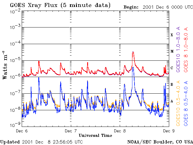 The operational data in the graph above has been modified to remove the scaling factor that has been applied by the Space Weather Prediction Center (SWPC). Because of the SWPC scaling factor in the operational data, flare indices for the operational data were reported as 42% smaller than for the science quality data. The scaling factor has also been removed from the solar flare list to reflect the true physical units.