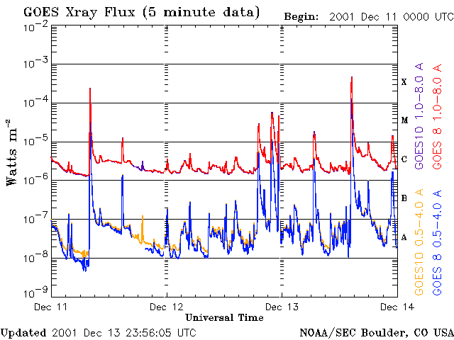 The operational data in the graph above has been modified to remove the scaling factor that has been applied by the Space Weather Prediction Center (SWPC). Because of the SWPC scaling factor in the operational data, flare indices for the operational data were reported as 42% smaller than for the science quality data. The scaling factor has also been removed from the solar flare list to reflect the true physical units.
