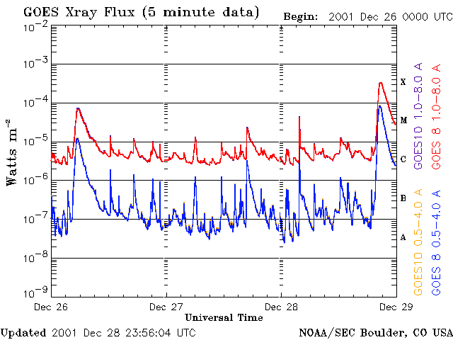 The operational data in the graph above has been modified to remove the scaling factor that has been applied by the Space Weather Prediction Center (SWPC). Because of the SWPC scaling factor in the operational data, flare indices for the operational data were reported as 42% smaller than for the science quality data. The scaling factor has also been removed from the solar flare list to reflect the true physical units.