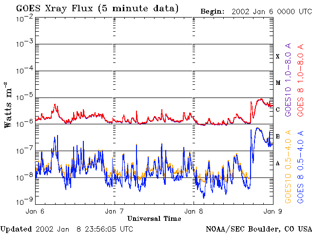 The operational data in the graph above has been modified to remove the scaling factor that has been applied by the Space Weather Prediction Center (SWPC). Because of the SWPC scaling factor in the operational data, flare indices for the operational data were reported as 42% smaller than for the science quality data. The scaling factor has also been removed from the solar flare list to reflect the true physical units.