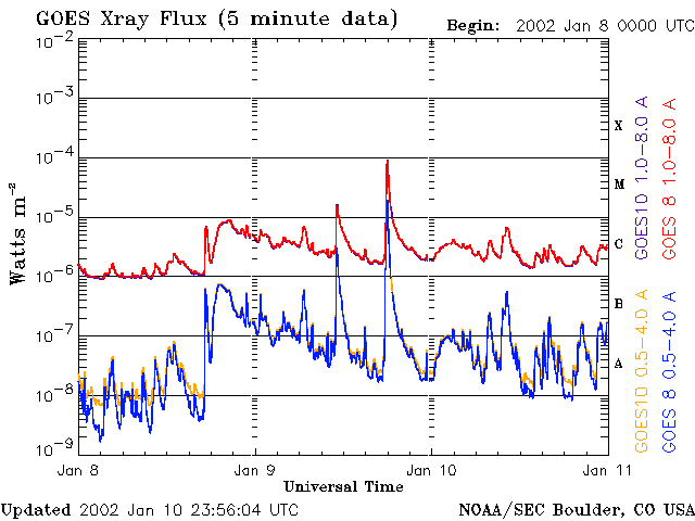 The operational data in the graph above has been modified to remove the scaling factor that has been applied by the Space Weather Prediction Center (SWPC). Because of the SWPC scaling factor in the operational data, flare indices for the operational data were reported as 42% smaller than for the science quality data. The scaling factor has also been removed from the solar flare list to reflect the true physical units.