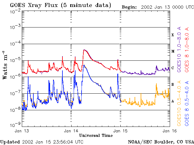 The operational data in the graph above has been modified to remove the scaling factor that has been applied by the Space Weather Prediction Center (SWPC). Because of the SWPC scaling factor in the operational data, flare indices for the operational data were reported as 42% smaller than for the science quality data. The scaling factor has also been removed from the solar flare list to reflect the true physical units.