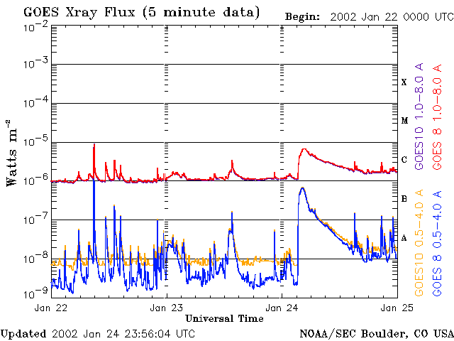 The operational data in the graph above has been modified to remove the scaling factor that has been applied by the Space Weather Prediction Center (SWPC). Because of the SWPC scaling factor in the operational data, flare indices for the operational data were reported as 42% smaller than for the science quality data. The scaling factor has also been removed from the solar flare list to reflect the true physical units.