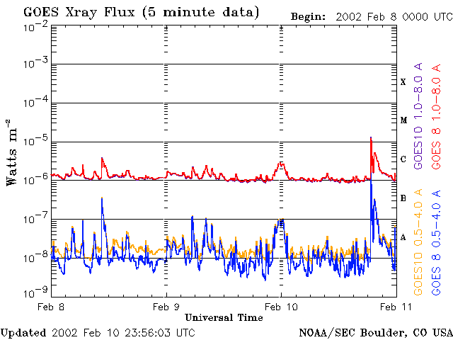 The operational data in the graph above has been modified to remove the scaling factor that has been applied by the Space Weather Prediction Center (SWPC). Because of the SWPC scaling factor in the operational data, flare indices for the operational data were reported as 42% smaller than for the science quality data. The scaling factor has also been removed from the solar flare list to reflect the true physical units.
