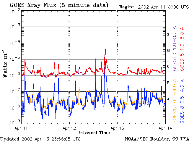 The operational data in the graph above has been modified to remove the scaling factor that has been applied by the Space Weather Prediction Center (SWPC). Because of the SWPC scaling factor in the operational data, flare indices for the operational data were reported as 42% smaller than for the science quality data. The scaling factor has also been removed from the solar flare list to reflect the true physical units.