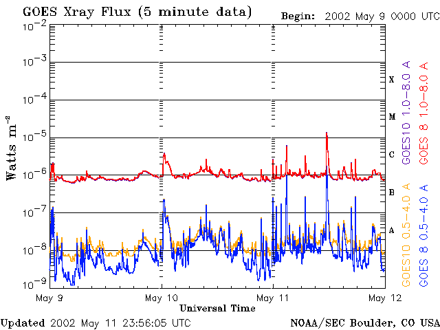 The operational data in the graph above has been modified to remove the scaling factor that has been applied by the Space Weather Prediction Center (SWPC). Because of the SWPC scaling factor in the operational data, flare indices for the operational data were reported as 42% smaller than for the science quality data. The scaling factor has also been removed from the solar flare list to reflect the true physical units.