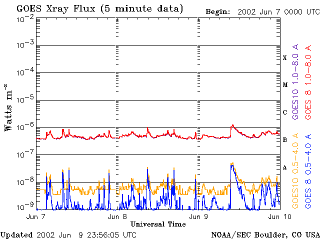 The operational data in the graph above has been modified to remove the scaling factor that has been applied by the Space Weather Prediction Center (SWPC). Because of the SWPC scaling factor in the operational data, flare indices for the operational data were reported as 42% smaller than for the science quality data. The scaling factor has also been removed from the solar flare list to reflect the true physical units.