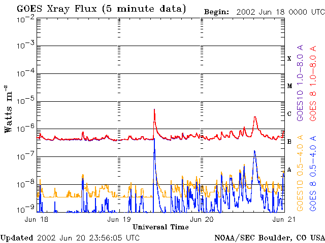 The operational data in the graph above has been modified to remove the scaling factor that has been applied by the Space Weather Prediction Center (SWPC). Because of the SWPC scaling factor in the operational data, flare indices for the operational data were reported as 42% smaller than for the science quality data. The scaling factor has also been removed from the solar flare list to reflect the true physical units.