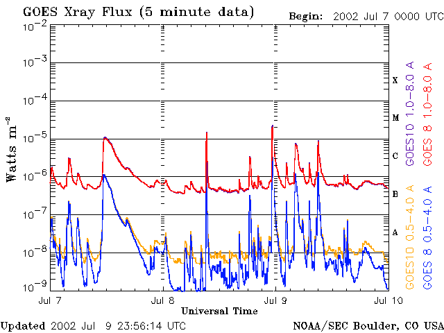 The operational data in the graph above has been modified to remove the scaling factor that has been applied by the Space Weather Prediction Center (SWPC). Because of the SWPC scaling factor in the operational data, flare indices for the operational data were reported as 42% smaller than for the science quality data. The scaling factor has also been removed from the solar flare list to reflect the true physical units.