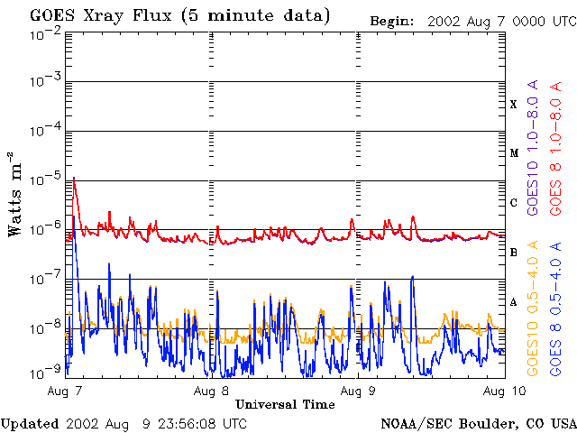 The operational data in the graph above has been modified to remove the scaling factor that has been applied by the Space Weather Prediction Center (SWPC). Because of the SWPC scaling factor in the operational data, flare indices for the operational data were reported as 42% smaller than for the science quality data. The scaling factor has also been removed from the solar flare list to reflect the true physical units.