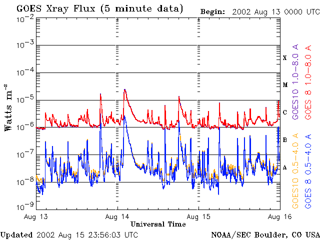 The operational data in the graph above has been modified to remove the scaling factor that has been applied by the Space Weather Prediction Center (SWPC). Because of the SWPC scaling factor in the operational data, flare indices for the operational data were reported as 42% smaller than for the science quality data. The scaling factor has also been removed from the solar flare list to reflect the true physical units.