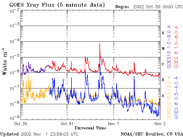 The operational data in the graph above has been modified to remove the scaling factor that has been applied by the Space Weather Prediction Center (SWPC). Because of the SWPC scaling factor in the operational data, flare indices for the operational data were reported as 42% smaller than for the science quality data. The scaling factor has also been removed from the solar flare list to reflect the true physical units.