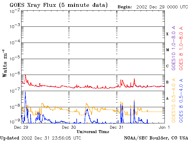 The operational data in the graph above has been modified to remove the scaling factor that has been applied by the Space Weather Prediction Center (SWPC). Because of the SWPC scaling factor in the operational data, flare indices for the operational data were reported as 42% smaller than for the science quality data. The scaling factor has also been removed from the solar flare list to reflect the true physical units.
