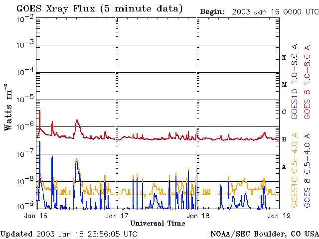 The operational data in the graph above has been modified to remove the scaling factor that has been applied by the Space Weather Prediction Center (SWPC). Because of the SWPC scaling factor in the operational data, flare indices for the operational data were reported as 42% smaller than for the science quality data. The scaling factor has also been removed from the solar flare list to reflect the true physical units.