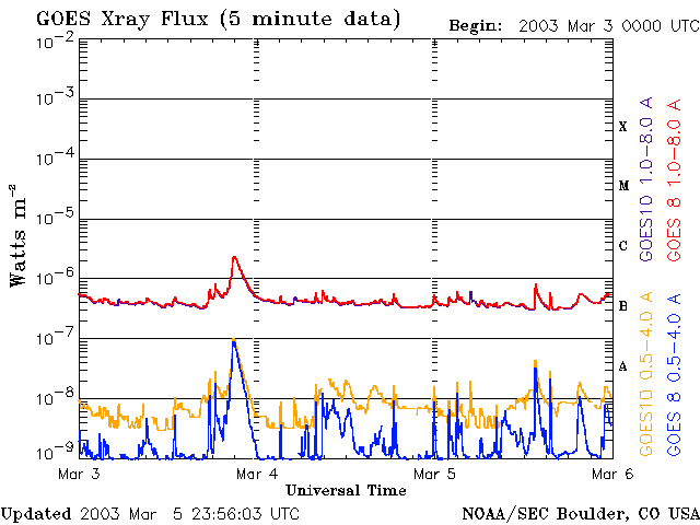 The operational data in the graph above has been modified to remove the scaling factor that has been applied by the Space Weather Prediction Center (SWPC). Because of the SWPC scaling factor in the operational data, flare indices for the operational data were reported as 42% smaller than for the science quality data. The scaling factor has also been removed from the solar flare list to reflect the true physical units.