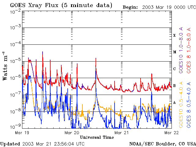 The operational data in the graph above has been modified to remove the scaling factor that has been applied by the Space Weather Prediction Center (SWPC). Because of the SWPC scaling factor in the operational data, flare indices for the operational data were reported as 42% smaller than for the science quality data. The scaling factor has also been removed from the solar flare list to reflect the true physical units.