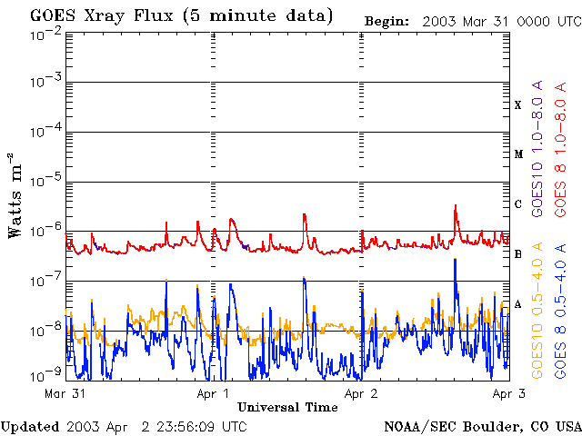 The operational data in the graph above has been modified to remove the scaling factor that has been applied by the Space Weather Prediction Center (SWPC). Because of the SWPC scaling factor in the operational data, flare indices for the operational data were reported as 42% smaller than for the science quality data. The scaling factor has also been removed from the solar flare list to reflect the true physical units.