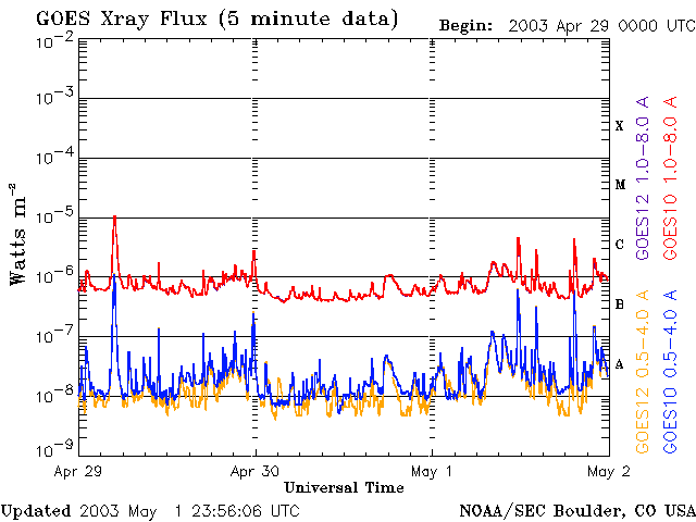 The operational data in the graph above has been modified to remove the scaling factor that has been applied by the Space Weather Prediction Center (SWPC). Because of the SWPC scaling factor in the operational data, flare indices for the operational data were reported as 42% smaller than for the science quality data. The scaling factor has also been removed from the solar flare list to reflect the true physical units.